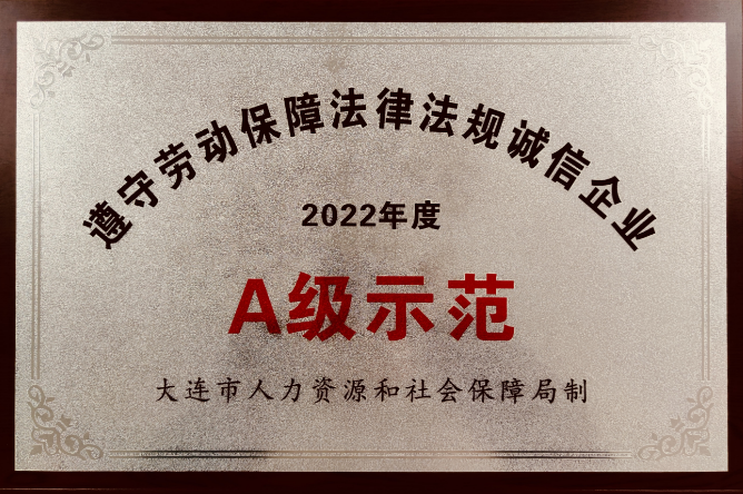 我公司獲評“大連市2022年度勞動保障守法誠信A級示范企業(yè)”。企業(yè)勞動保障守法誠信等級評價是由人力資源社會保障行政部門根據(jù)企業(yè)遵守勞動保障法律、法規(guī)和規(guī)章的情況來評定的,每年評定一次。“A級示范企業(yè)”為最高等級。我公司一直注重誠信守法經(jīng)營,構(gòu)建和諧勞動關(guān)系,已連續(xù)多年獲得該項(xiàng)榮譽(yù)。